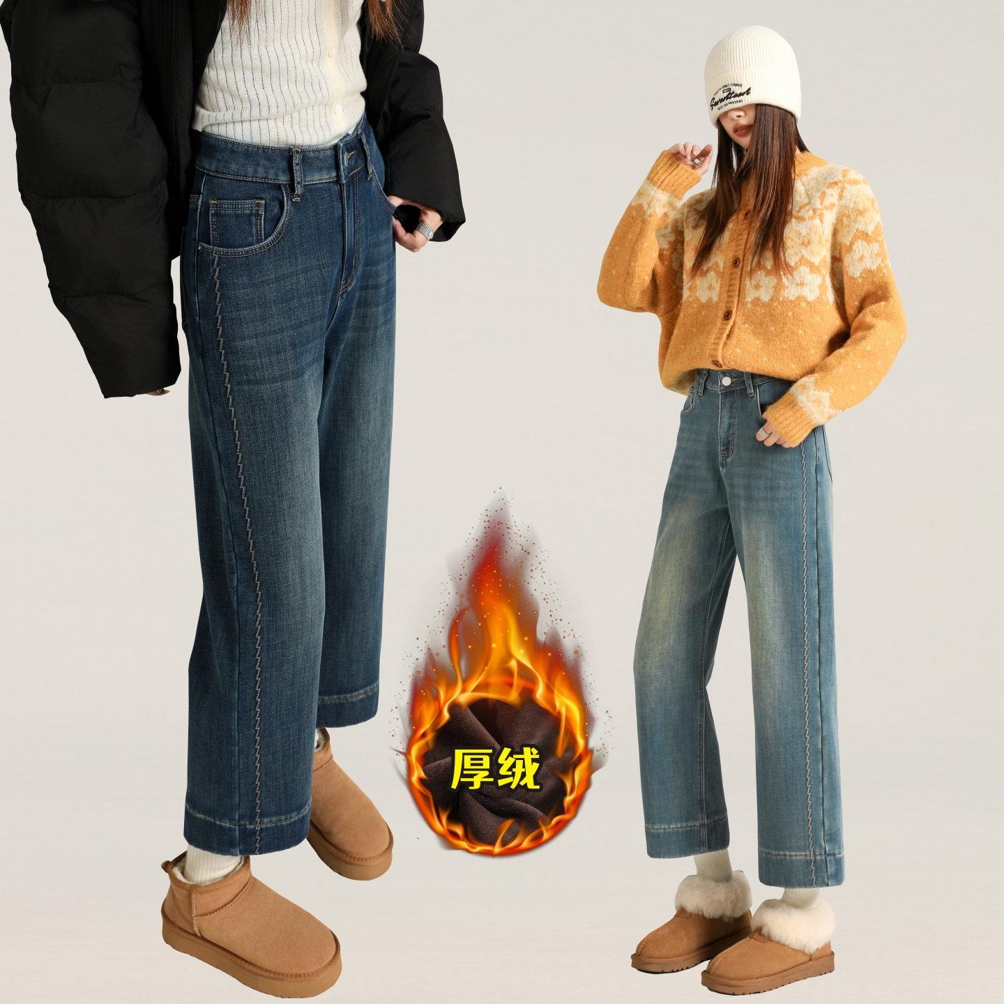 - 女加绒牛仔裤高腰