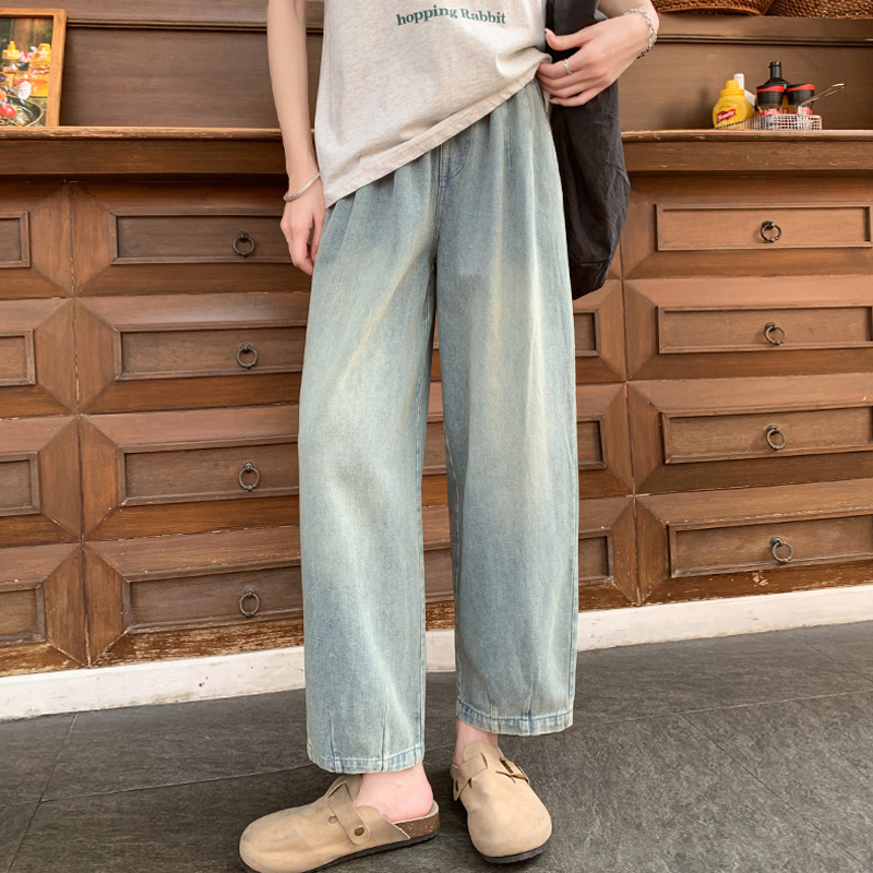 松紧腰直筒牛仔裤女款2024年新款春秋季九分裤休闲显瘦显腿长裤子