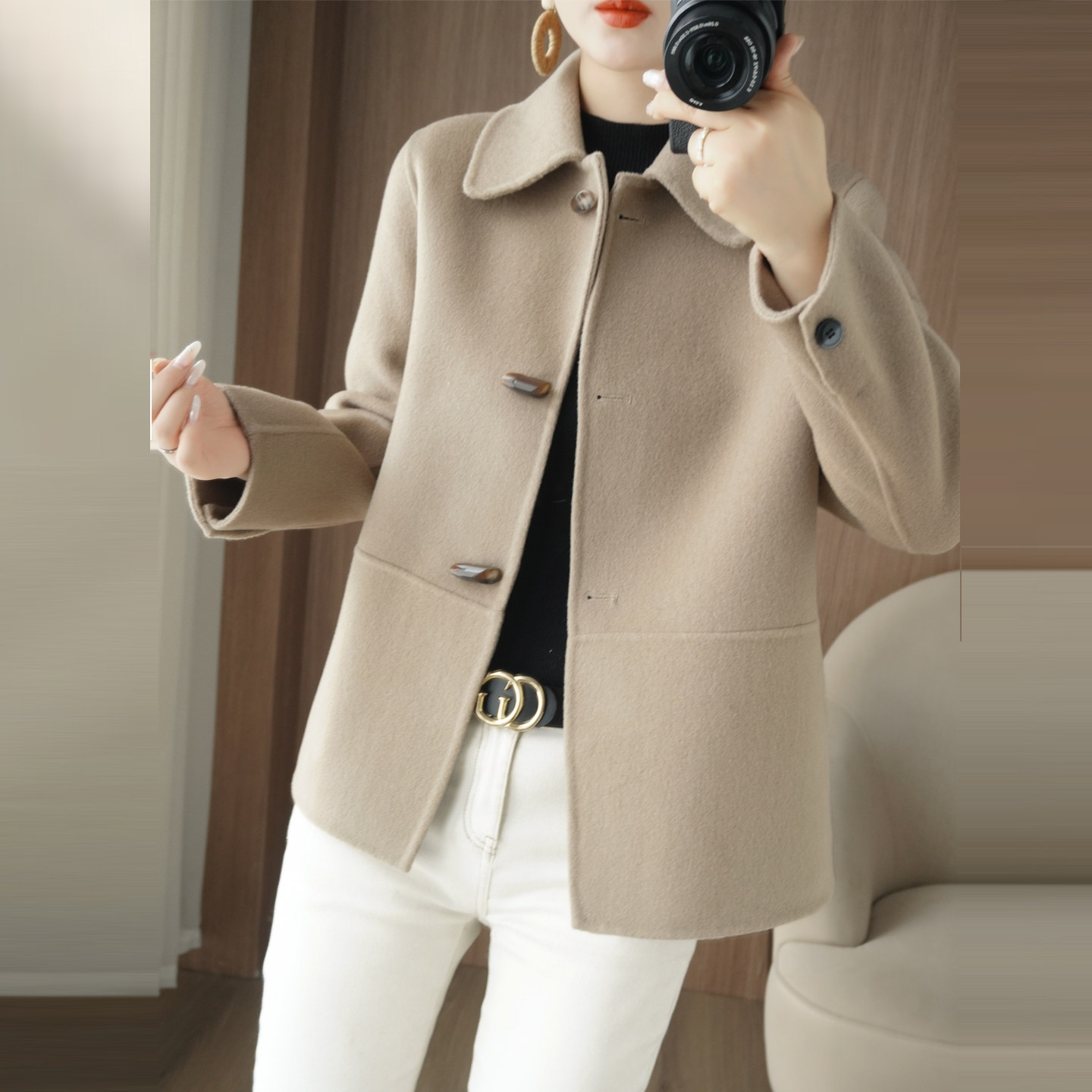 时尚百搭牛角扣双面绒大衣外套短款秋冬新款妈妈装双面羊毛呢外套