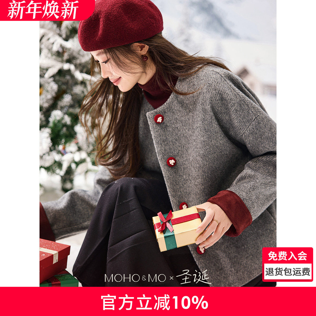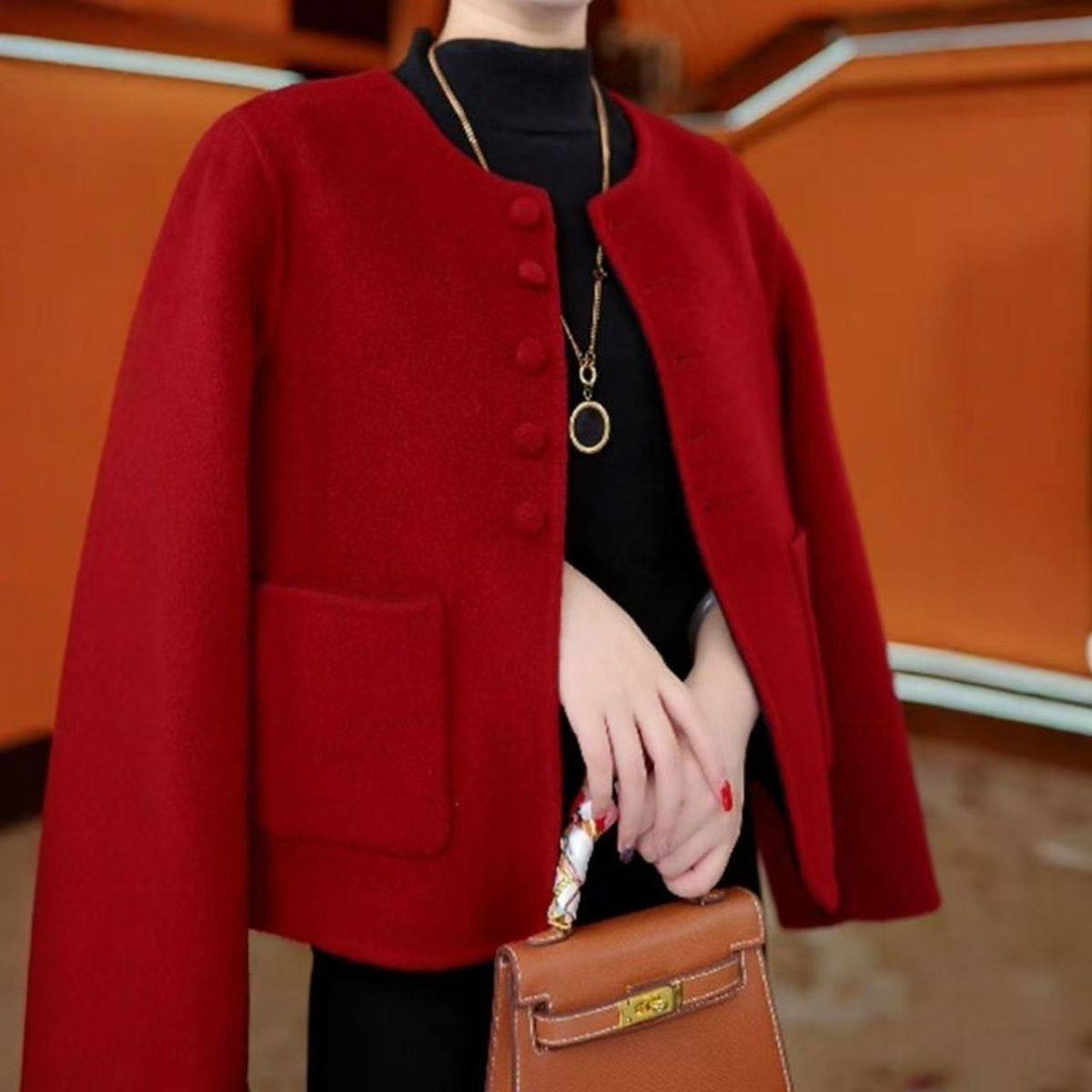 羊毛呢外套女短款圆领红色韩版百搭小众秋冬新款双面呢大衣小个子