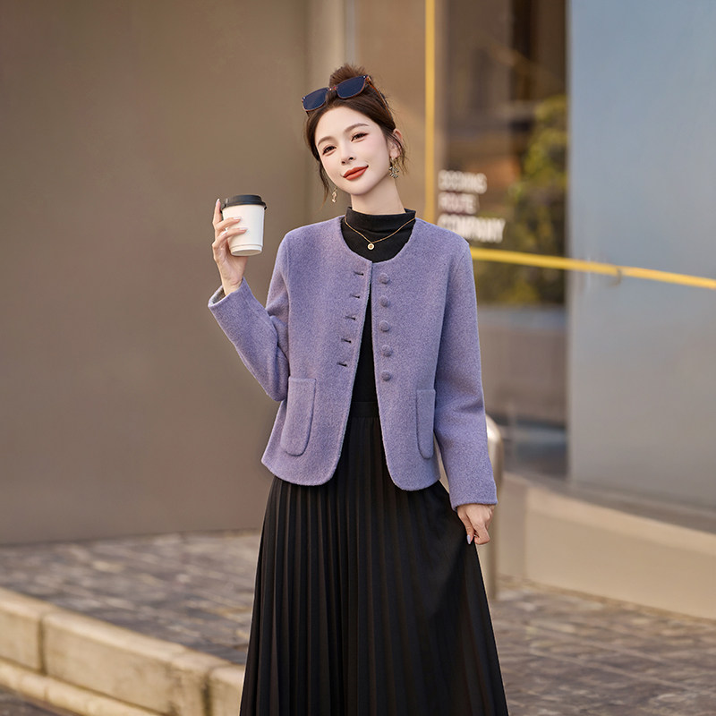 2025新中式百搭双面羊绒大衣女士国风短款小个子圆领显瘦毛呢外套