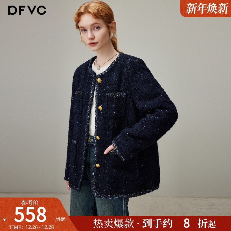 dfvc小香风羊毛短款毛呢外套女2025年冬季新款亮片宽松百搭上衣厚