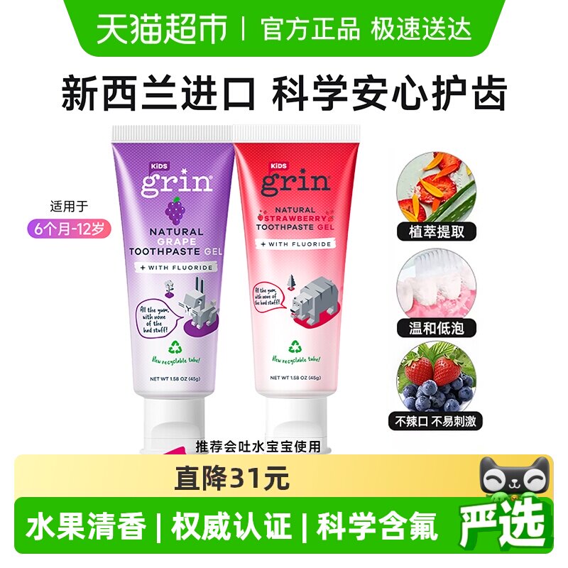 grin进口宝宝儿童牙膏含氟防蛀0到3-6-12岁不辣口换牙期植萃低泡