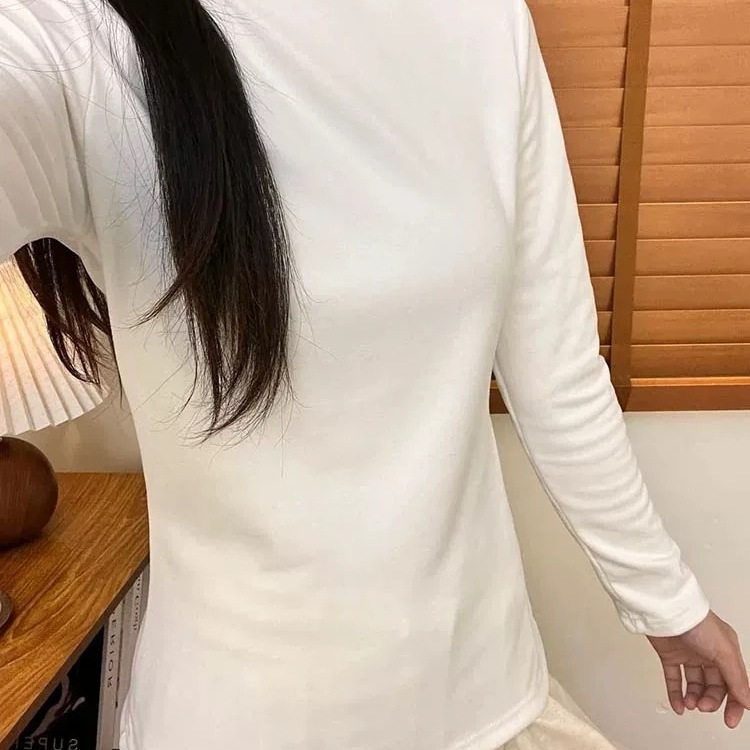 白色半高领打底衫女春秋冬德绒加厚内搭修身长袖上衣加绒保暖T恤