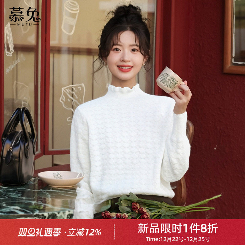 慕兔法式白色半高领打底衫女2025冬季新款设计感小众长袖针织上衣