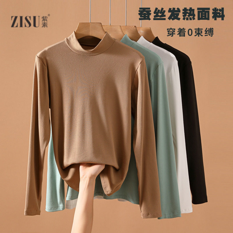 秋冬季精梳棉加厚磨毛中半高领打底衫女内搭白色长袖t恤上衣秋衣