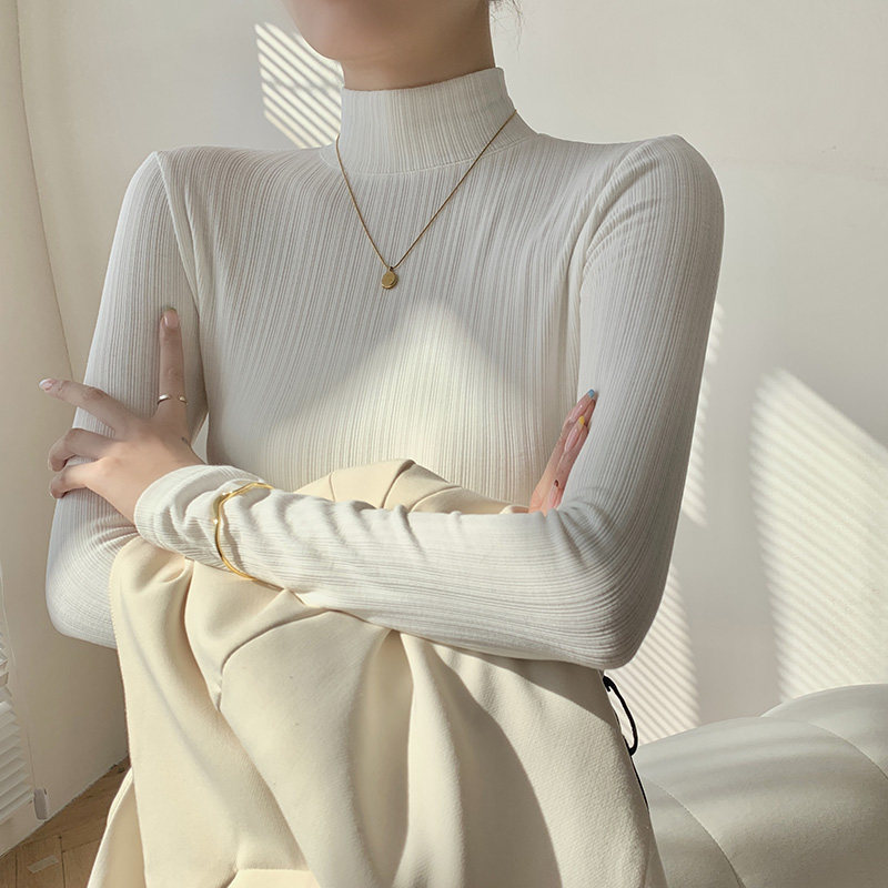 白色半高领打底衫女秋冬内搭修身长袖正肩小立领上衣叠穿中领T恤