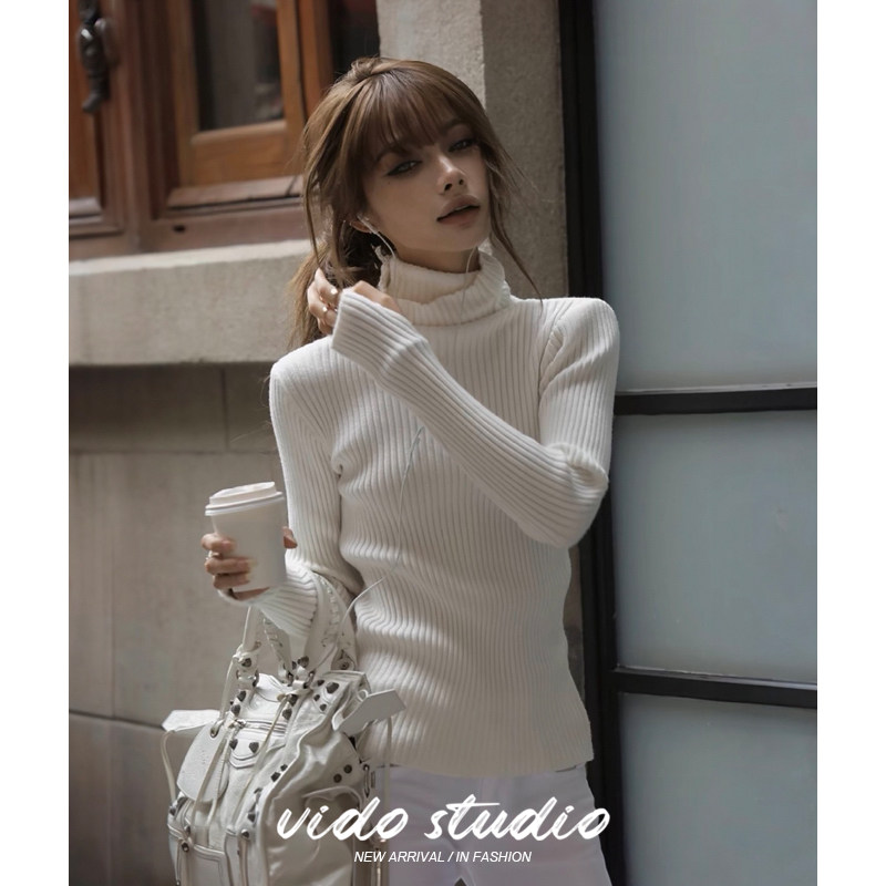 ranran博主白色半高领打底衫女气质内搭修身显瘦正肩针织上衣秋冬
