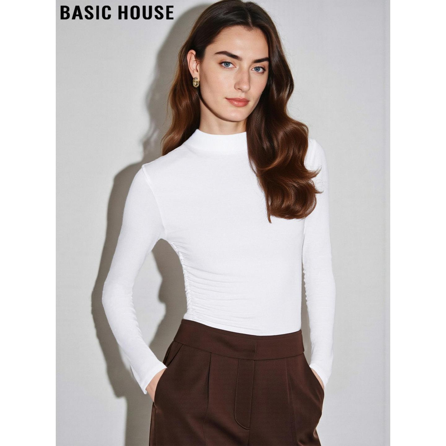 Basic House/百家好白色半高领打底衫女冬季内搭收腰褶皱内搭上衣