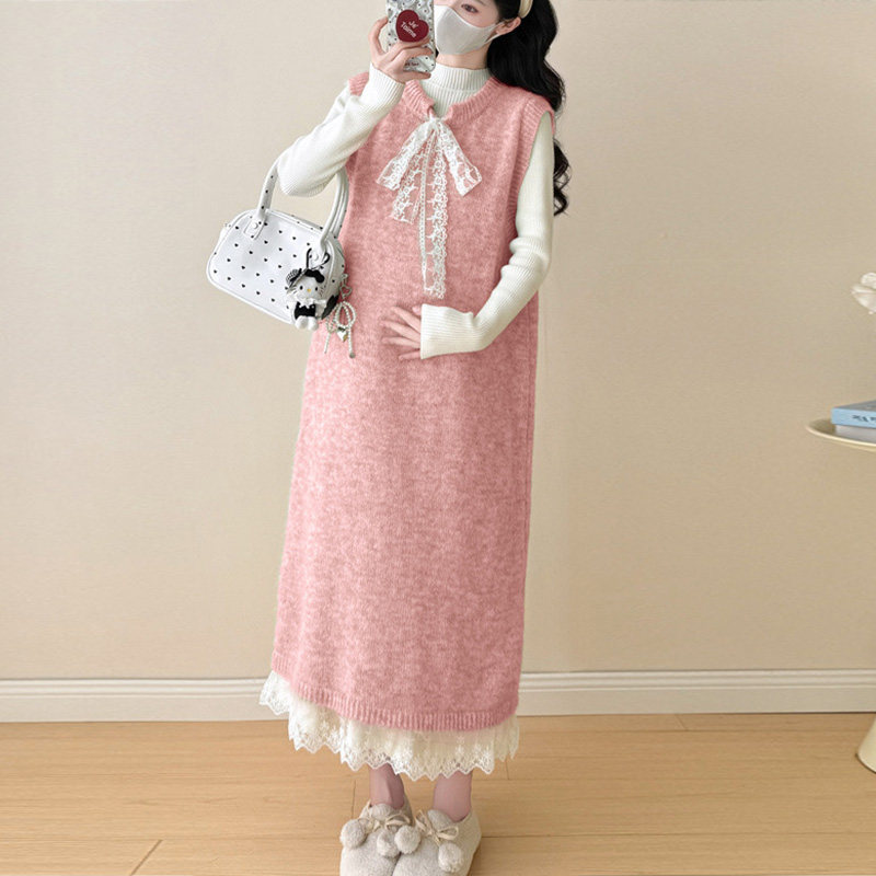 孕妇装背心裙套装秋冬新款蕾丝V领系带针织背心裙宽松毛衣裙套装