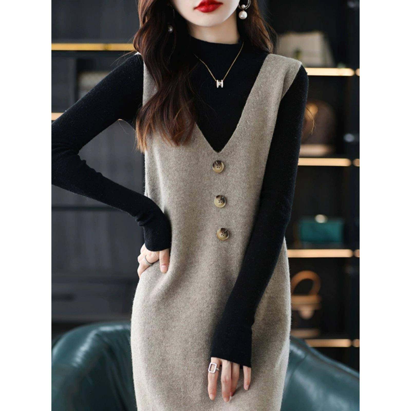 针织马甲背心裙两件套女秋冬v领百搭羊毛连衣裙2025冬季毛衣裙子