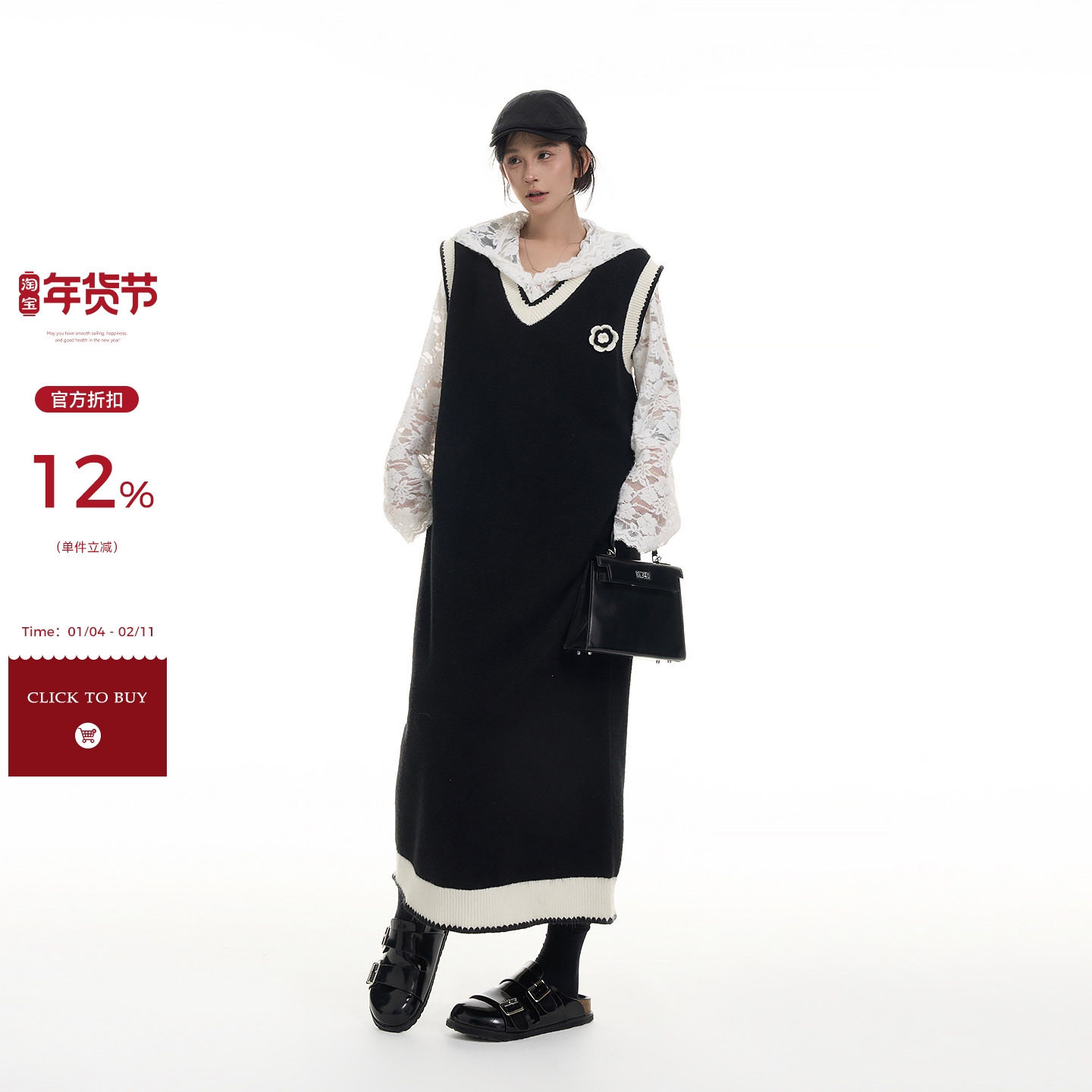 牛小力, 毛衣两件套 复古风V领收摆马甲背心+防走光短裙2025冬季