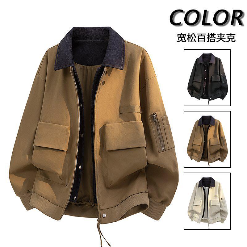 男士外套春秋季休闲百搭高街复古翻领潮流时尚百搭上衣服春装夹克
