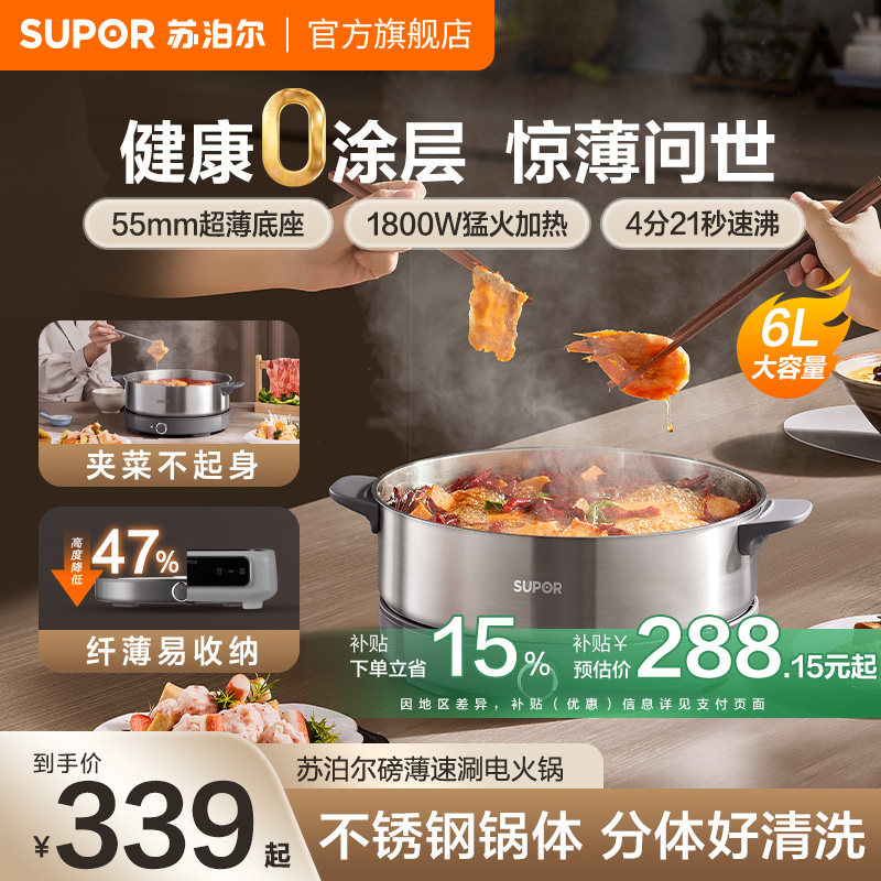 苏泊尔电火锅家用大火力速涮0涂层不锈钢分体易清洗多功能电煮锅