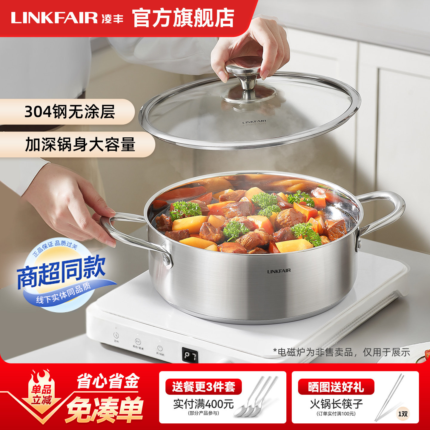 凌丰双娇304不锈钢清汤锅火锅锅家用加厚火锅盆打边炉电磁炉燃气