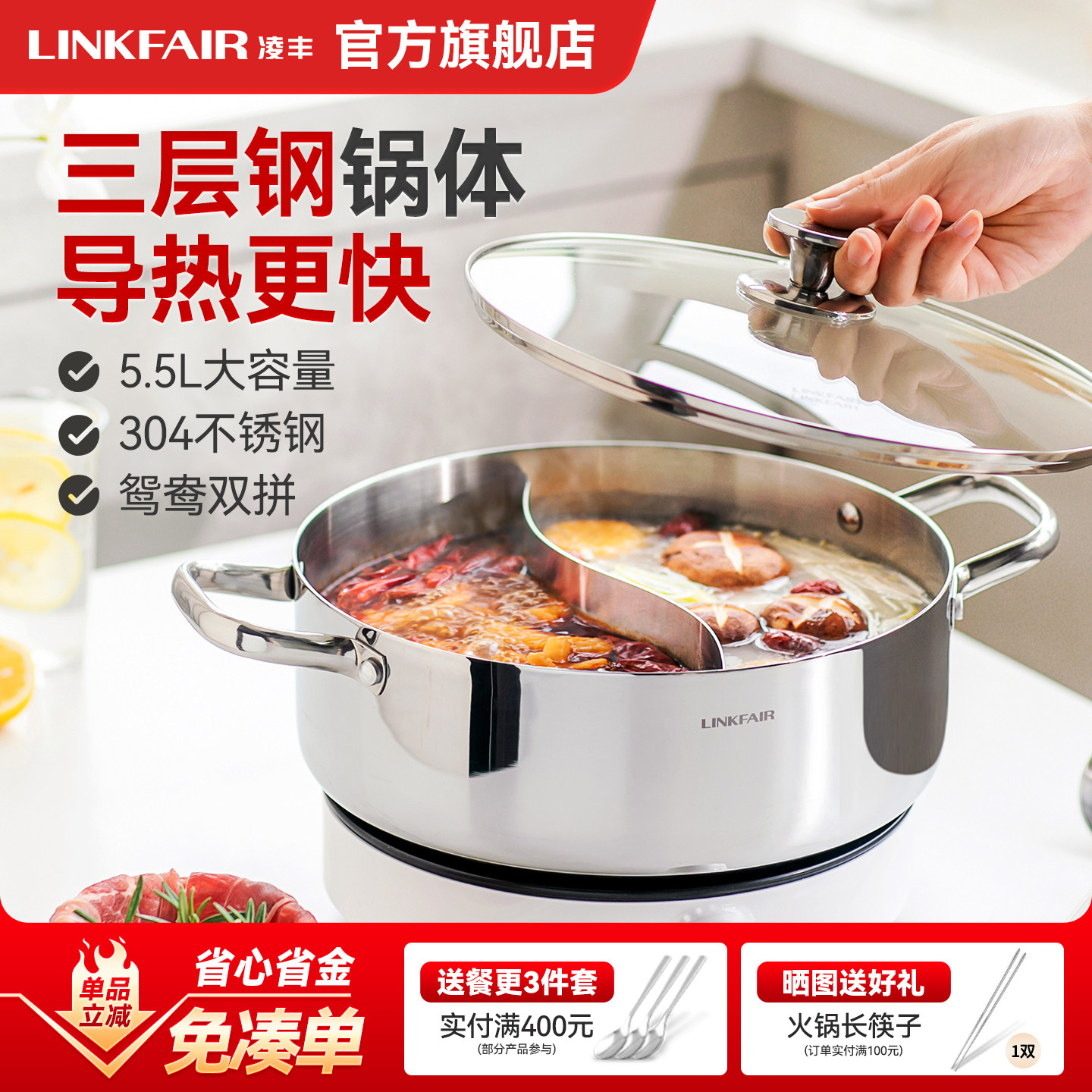凌丰鸳鸯锅加厚304不锈钢火锅锅盆一体锅家用电磁炉火锅专用锅