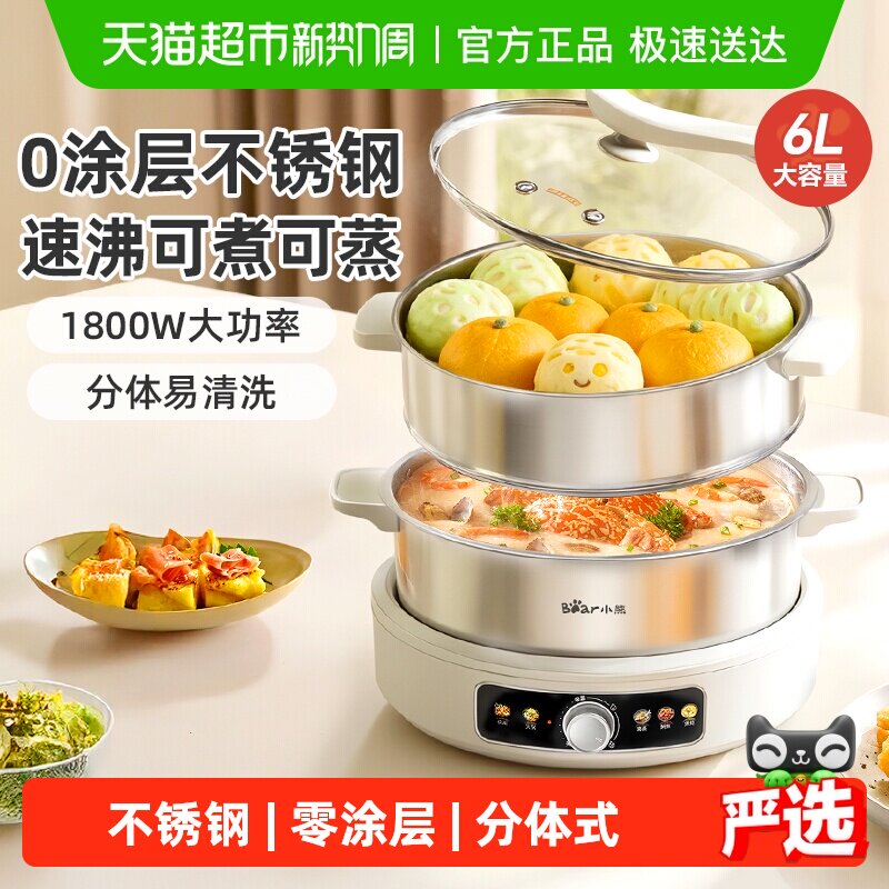 小熊电火锅不锈钢家用电蒸锅分体式0涂层电热锅无涂层煮蒸多功能