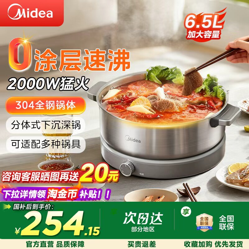 美的电热火锅0涂层不锈钢家用分体式7L升大容量电煮锅2026年新款