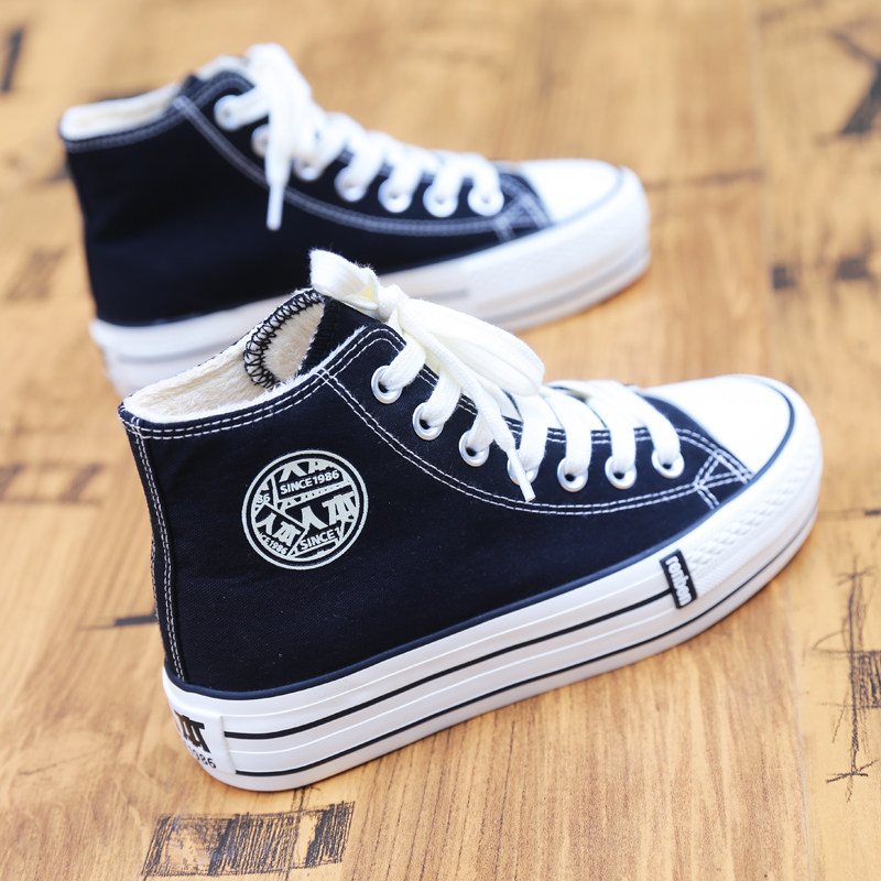 人本加绒高帮帆布鞋女秋冬保暖韩版百搭学生板鞋黑色系带平底棉鞋