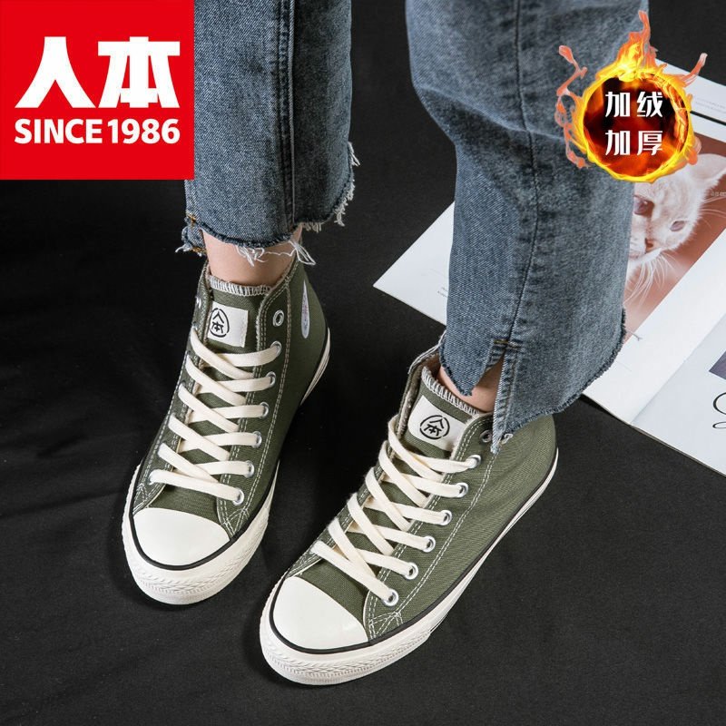 人本加绒高帮帆布鞋女2023秋冬新款学生二棉棉鞋韩版百搭复古板鞋