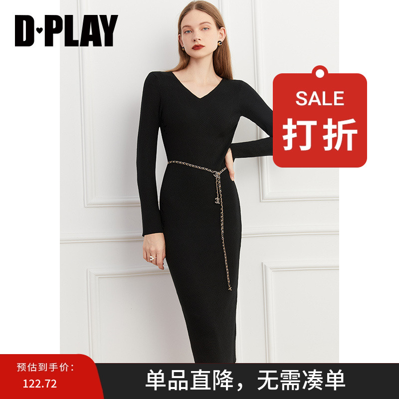 DPLAY【惠品】秋装季新品通勤ol经典黑色V领修身螺纹针织连衣裙
