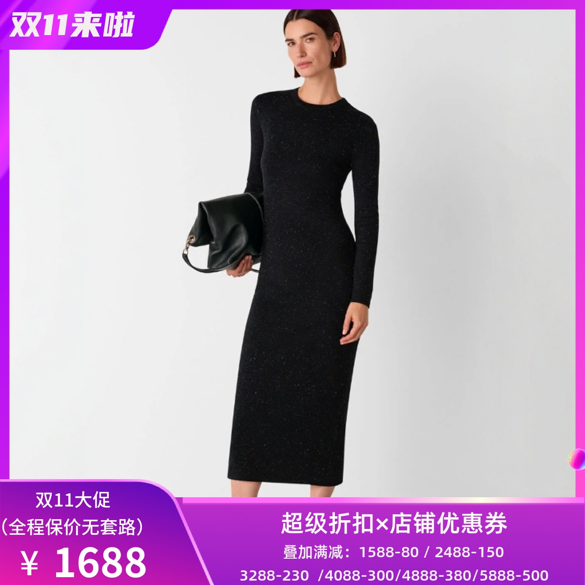 WHISTLES长袖连衣裙正装裙黑色包臀中长款金属亮丝修身日常通勤OL