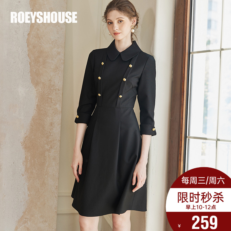 罗衣气质娃娃领收腰连衣裙2025春季新款知性OL黑色大摆裙子09142