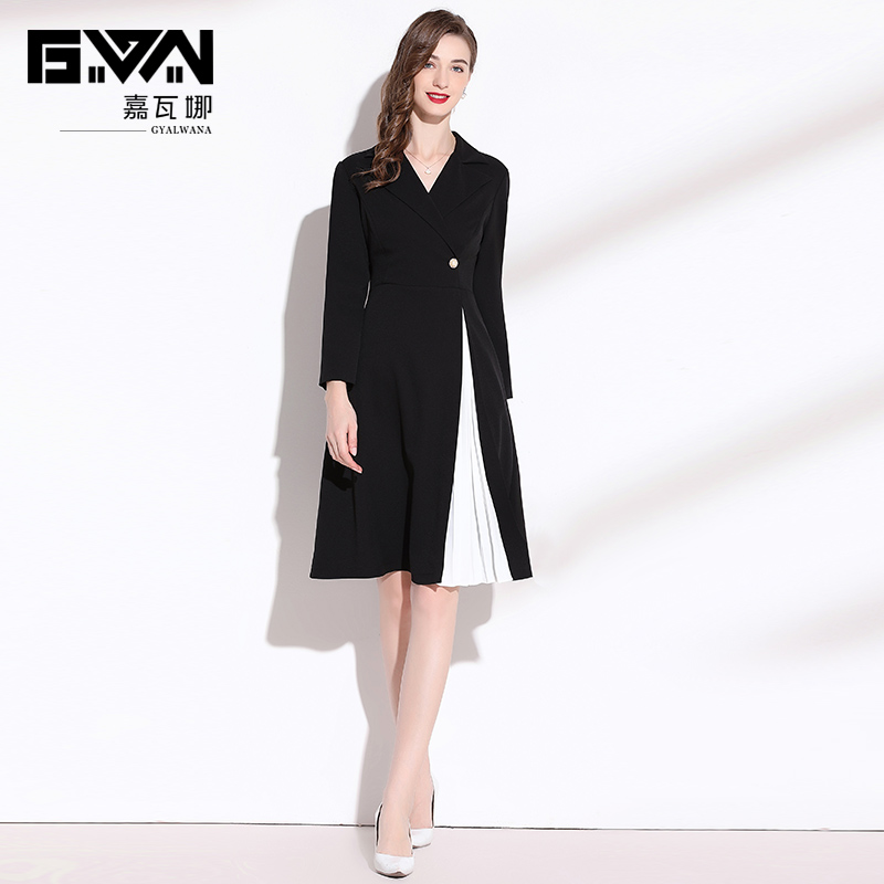 罗衣知性OL拼接西装连衣裙女2025秋季新款气质收腰黑色裙子07940
