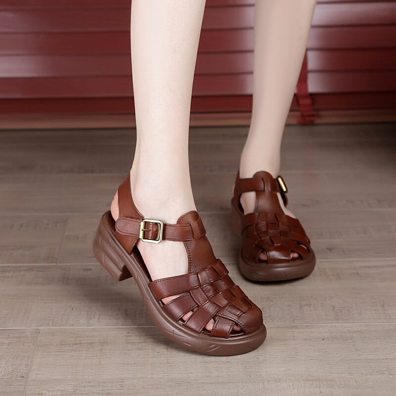 9051编织凉鞋软底真皮妈妈鞋厚底中跟鞋原创复古夏新款手工休闲鞋