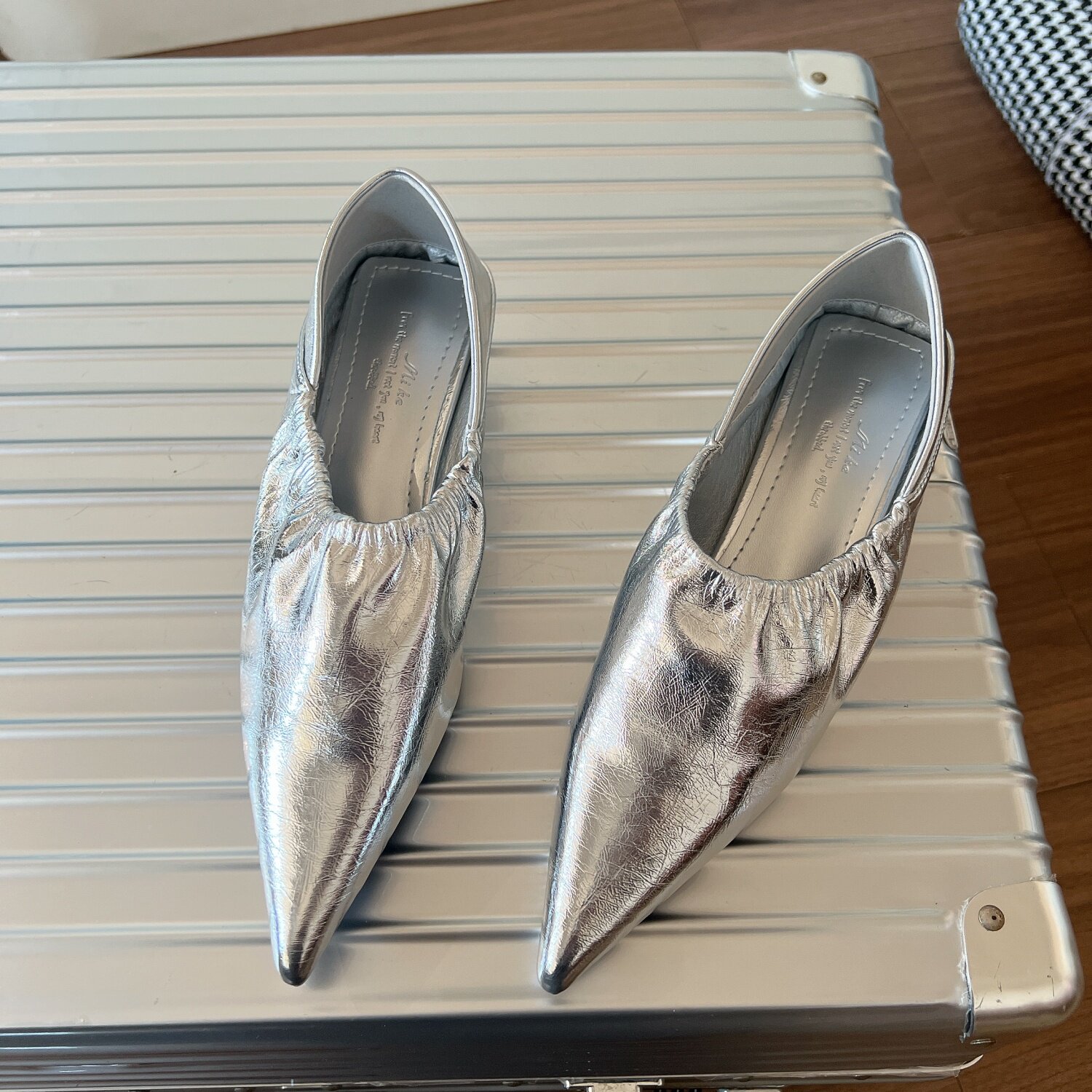 2026春季新款欧美风银色尖头褶皱浅口单鞋女通勤中跟鞋子百搭女鞋