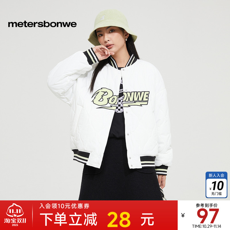 美特斯邦威梭织褛棉服女秋冬时尚字母点缀撞色棒球宽松舒适短款Q