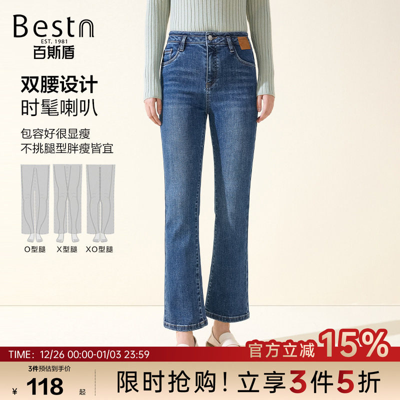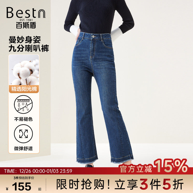 百斯盾官方女士牛仔裤秋款时尚设计感弹力舒适宽松显瘦九分喇叭裤