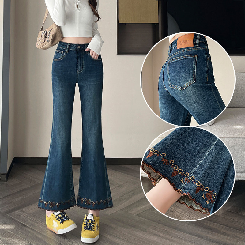 小个子八九分喇叭牛仔裤女秋2025新款高腰弹力显瘦国风刺绣微喇裤