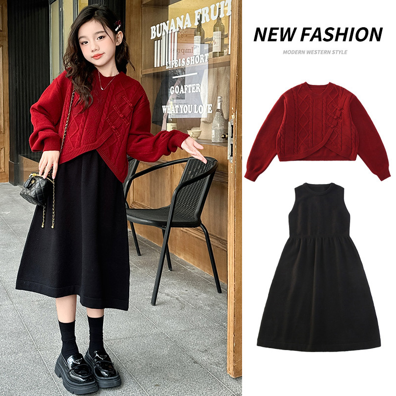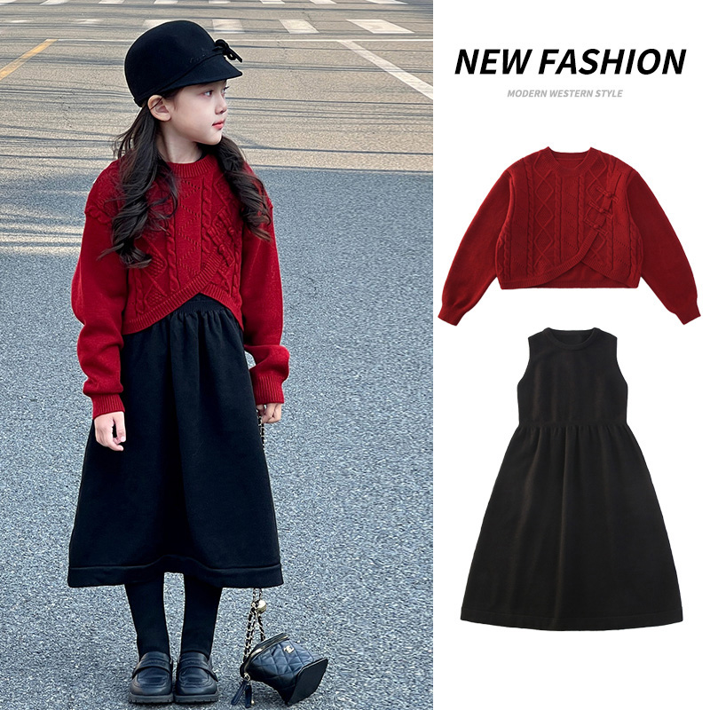 女童连衣裙秋冬款2025新款儿童裙子冬季过年服女大童套裙红色年服