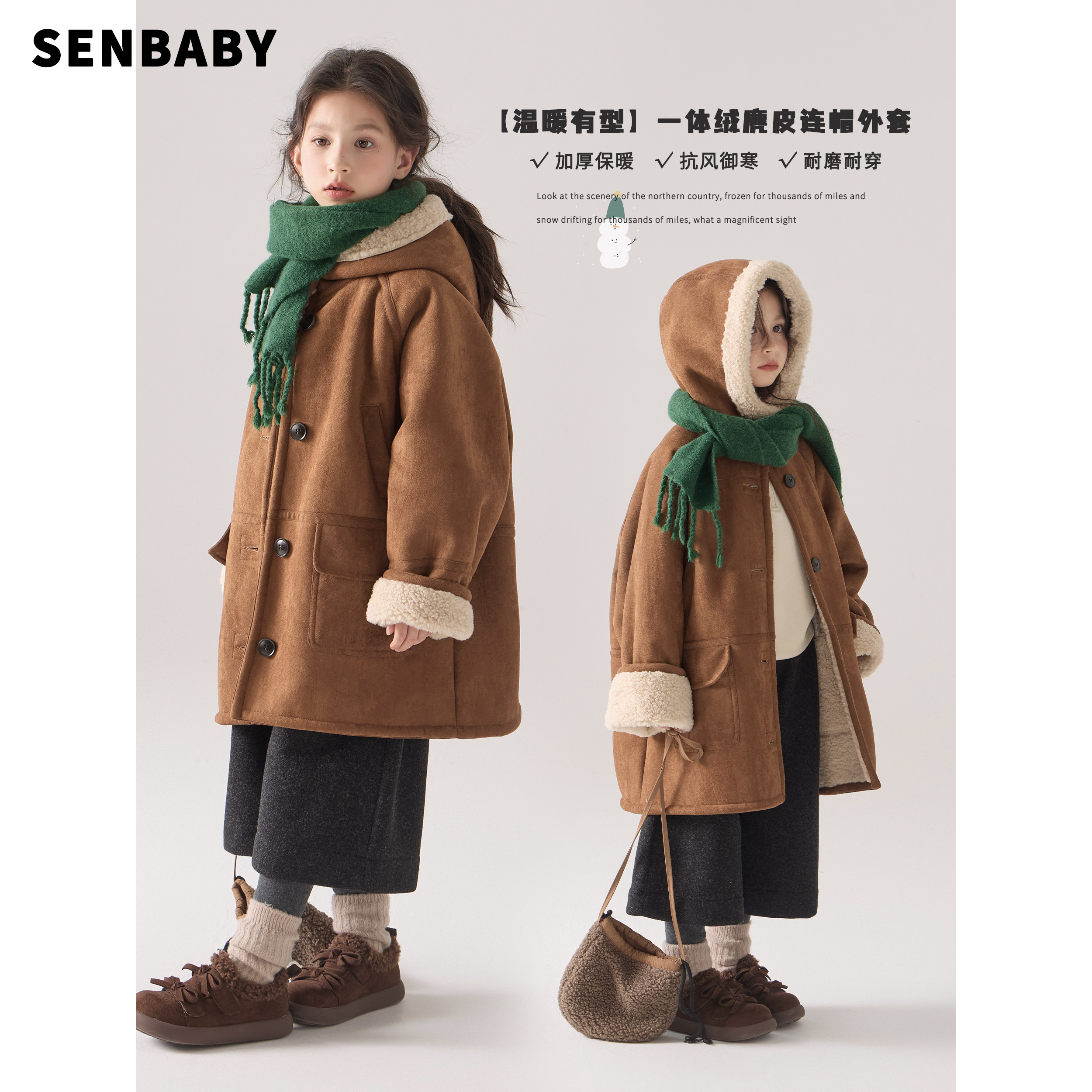 senbaby童装女童连帽大衣外套长款冬季防风保暖加厚皮毛一体大衣