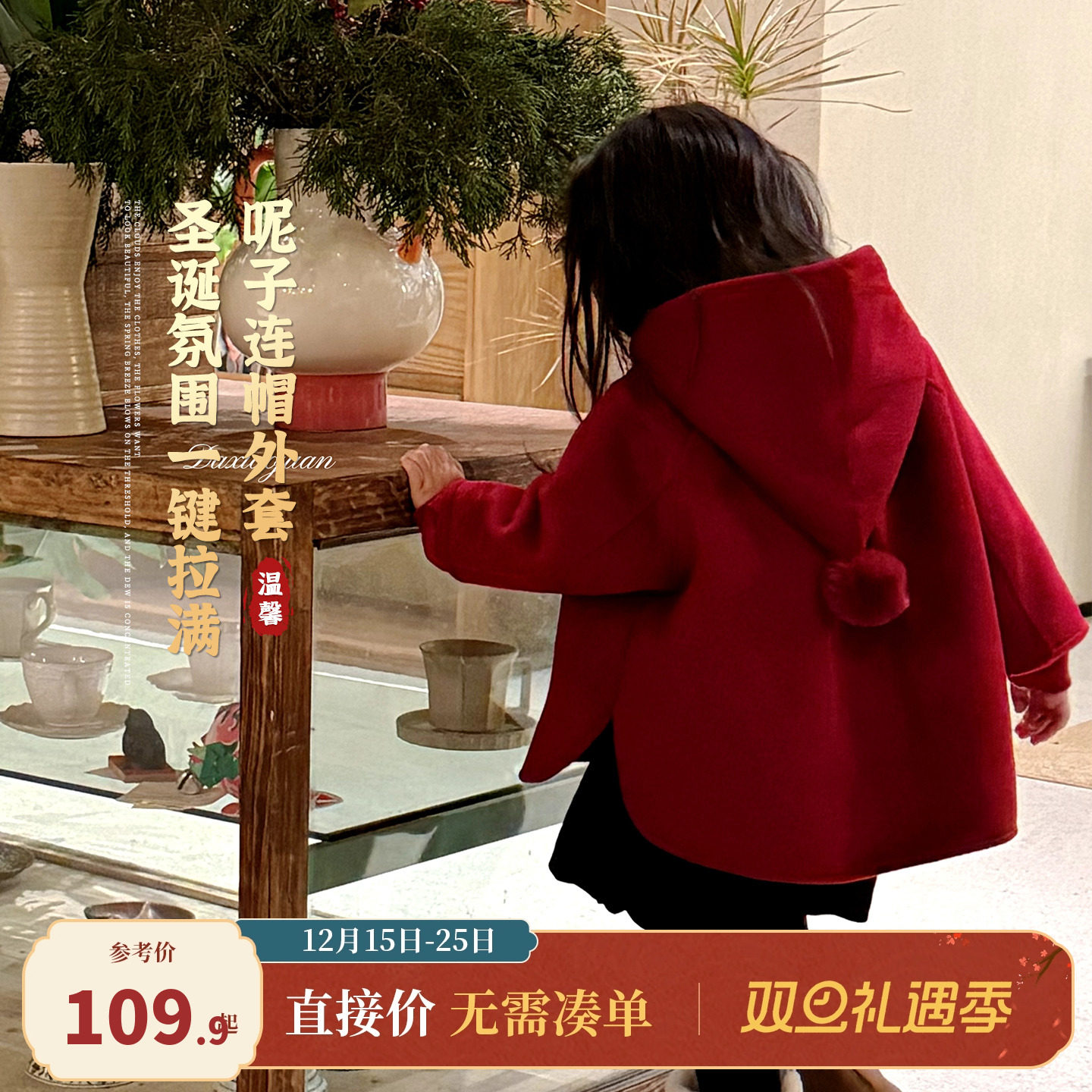 大小卷女童外套冬装2025新款儿童加厚圣诞红色女孩新年呢子大衣