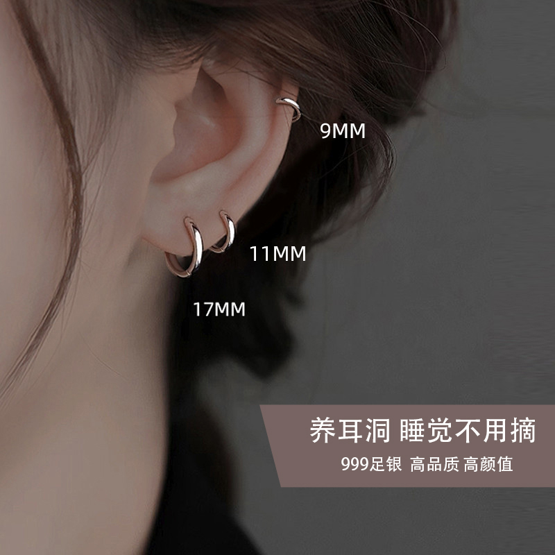 S999耳圈纯银耳环耳坠素圈耳饰女养耳洞耳扣小睡觉免摘耳骨环耳钉
