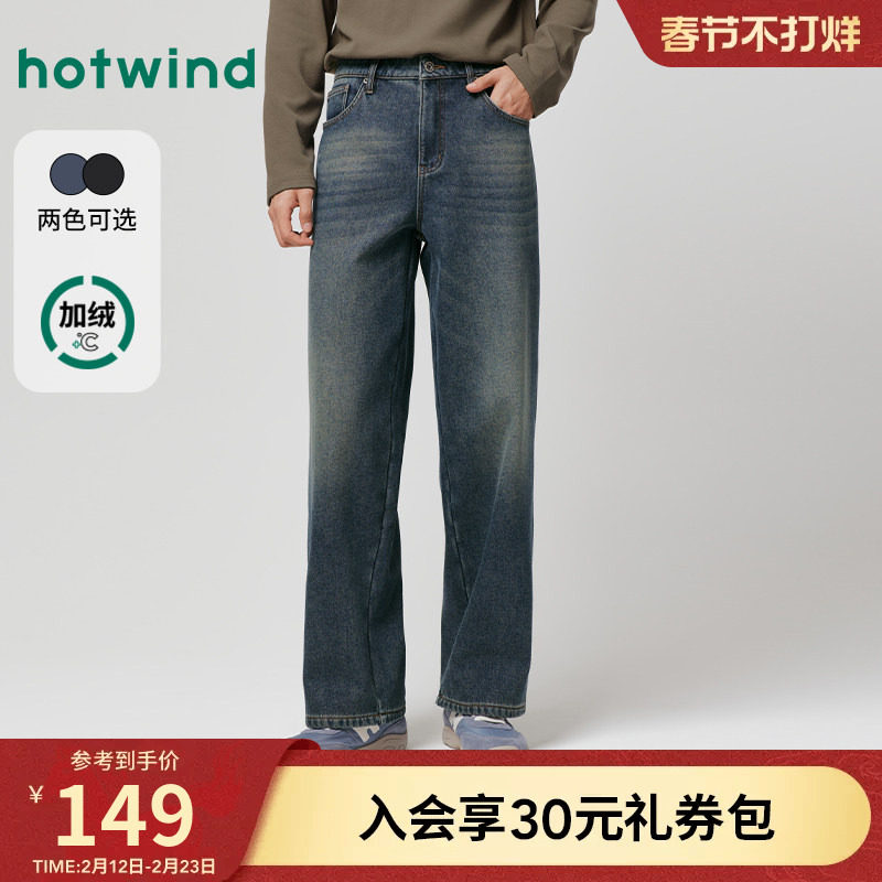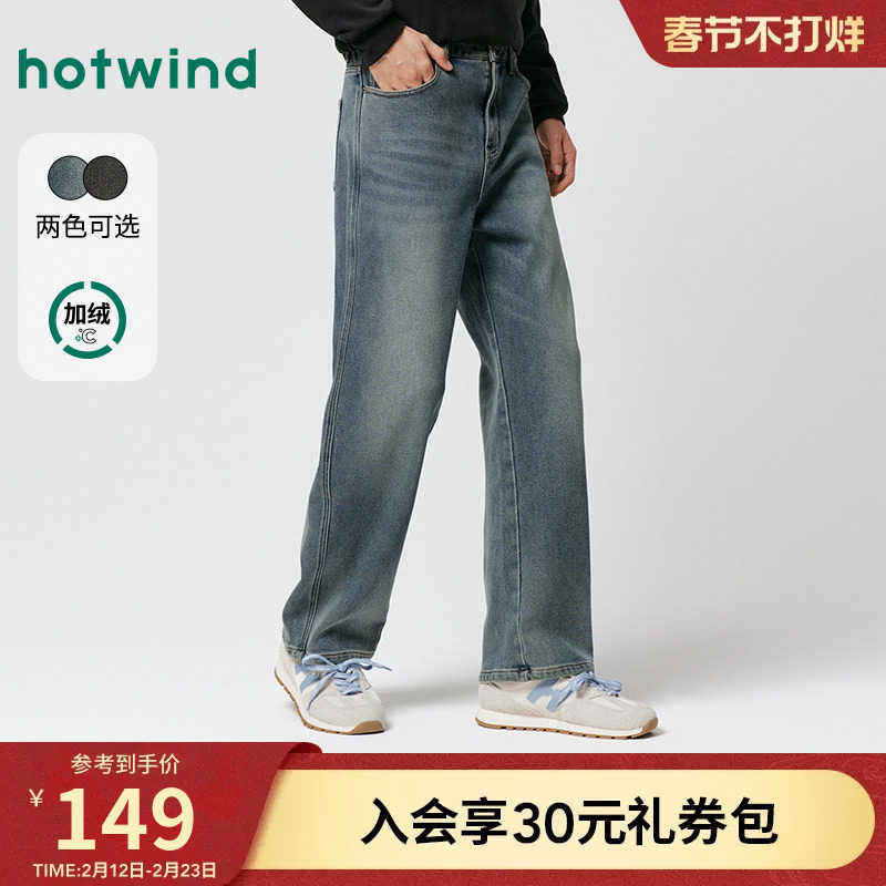 热风男士加绒牛仔裤宽松直筒2025年冬季新款保暖时尚百搭休闲长裤