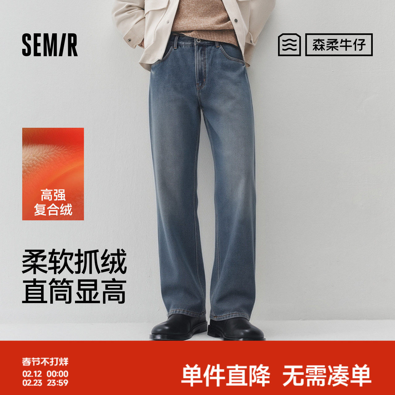 森柔|商场同款森马牛仔裤男冬季加绒宽松直筒裤2025新款复古长裤