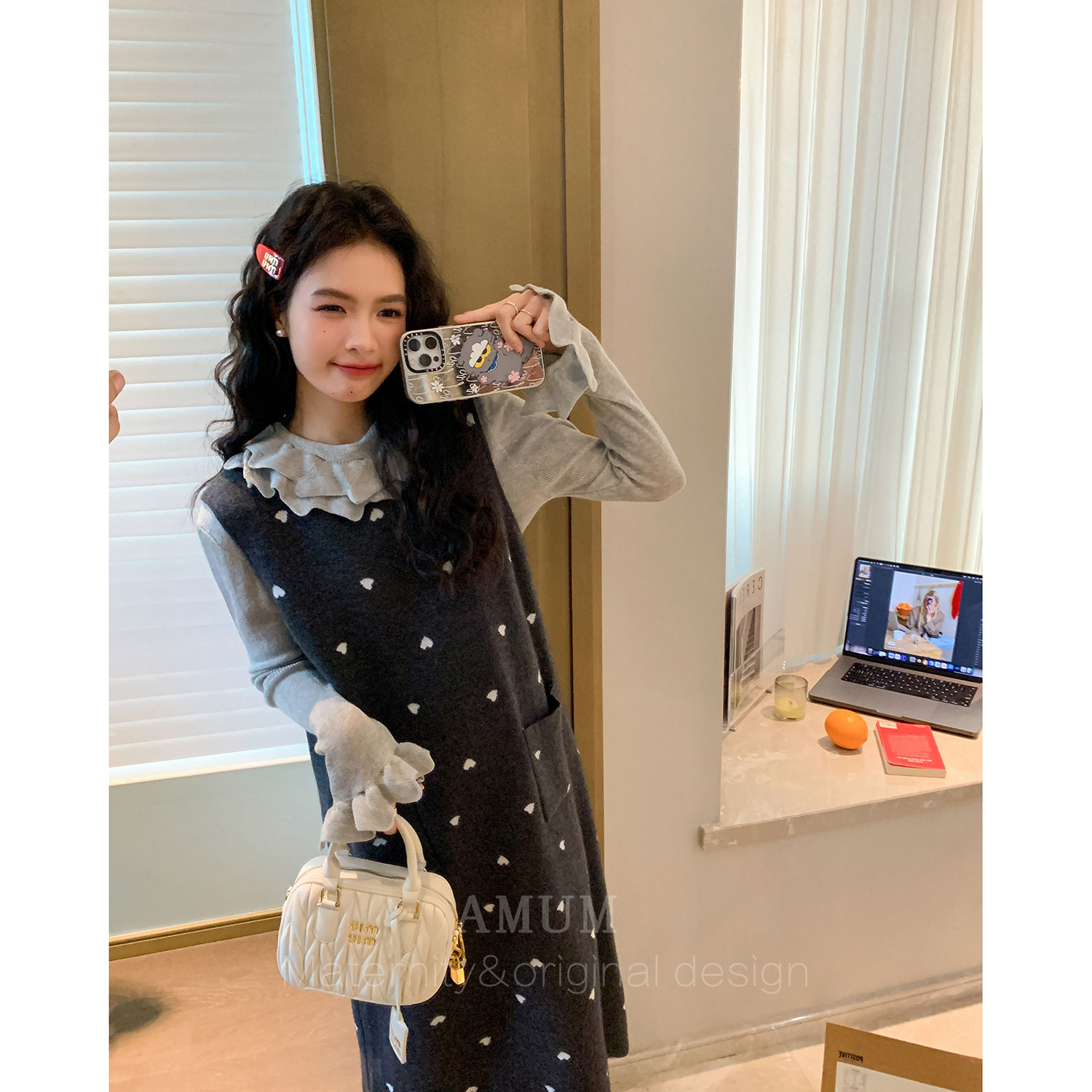 ◆AMUM孕妇装◆冬日甜心~甜美荷叶领内搭波点针织休闲背心裙套装