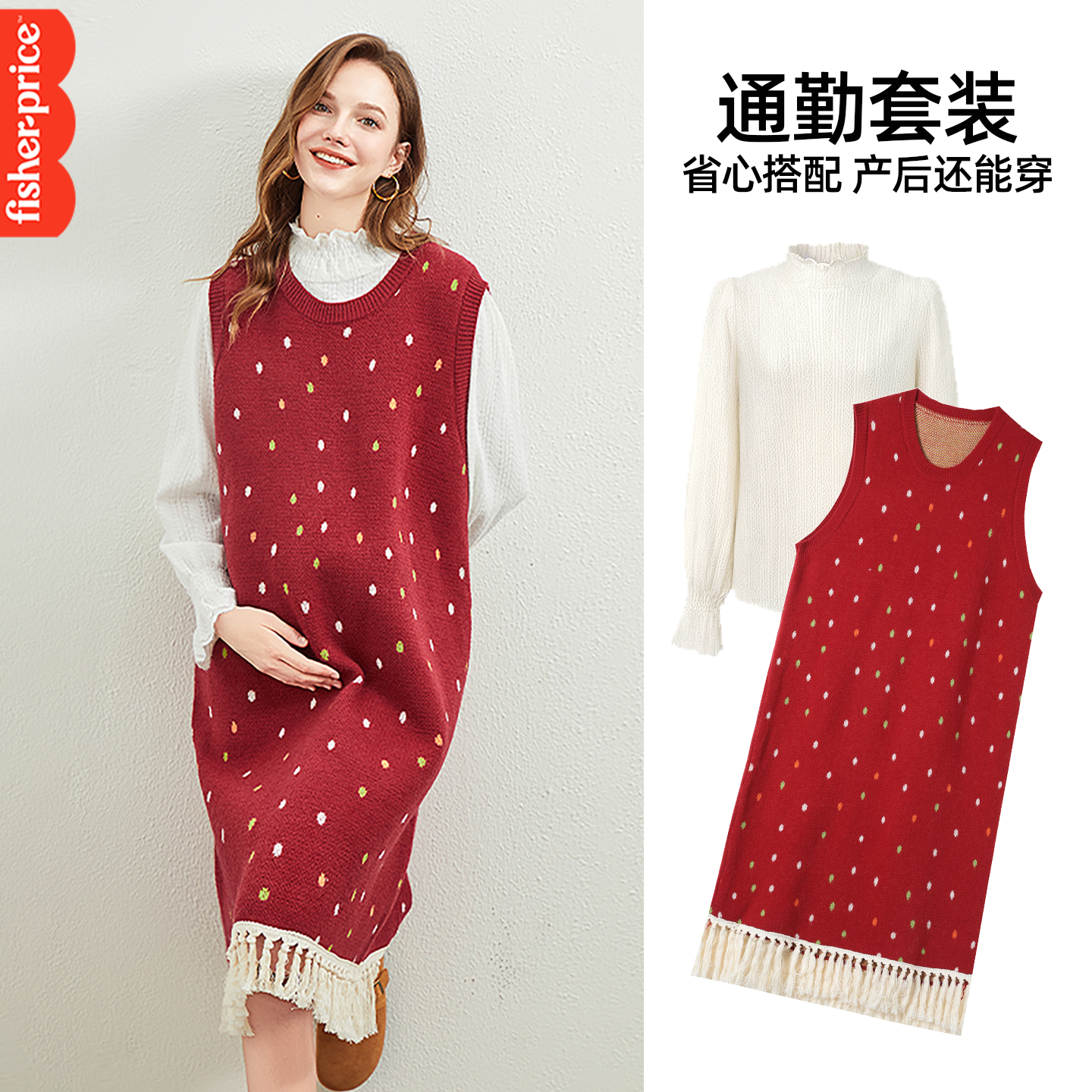 费雪孕妇装孕期过年穿搭新款时尚秋冬休闲蕾丝毛衣马甲连衣裙套装