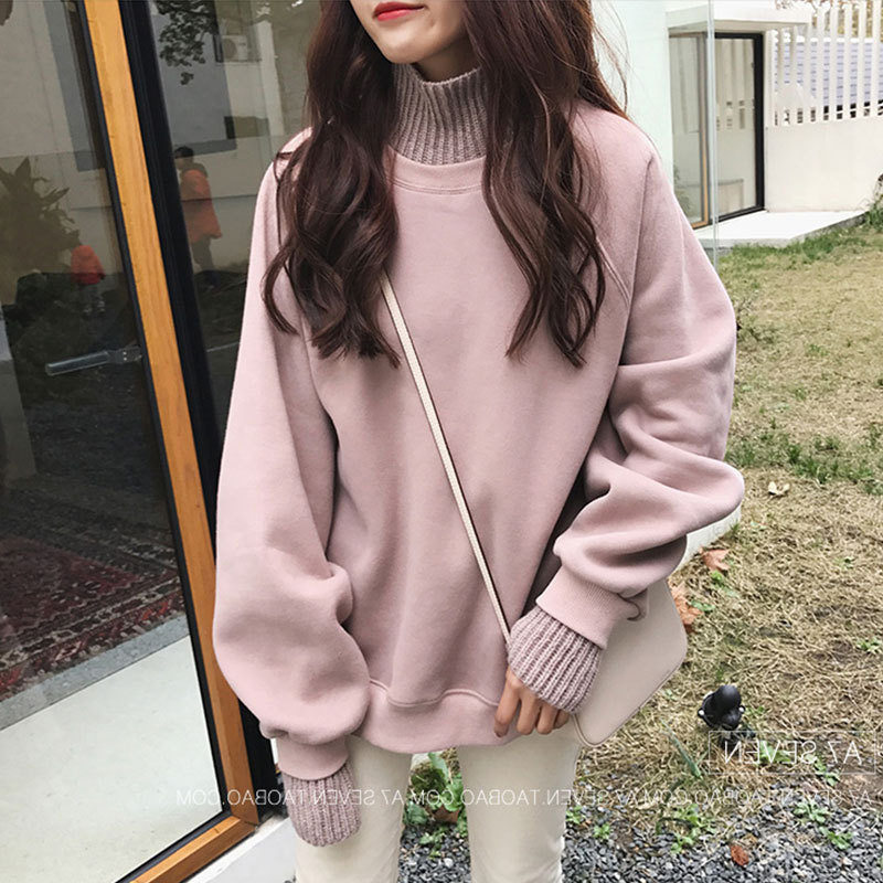EU加绒加厚卫衣女秋冬新款韩版潮学生宽松懒惰假两件高领毛衣外套