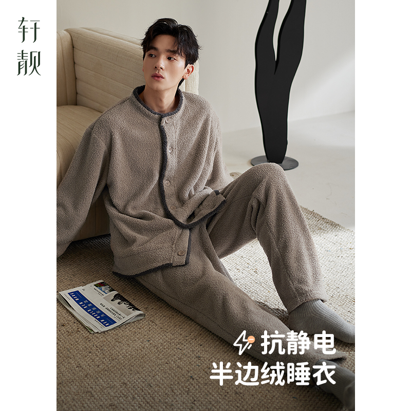 轩靓半边绒睡衣男秋冬季加绒加厚珊瑚绒2025新款可外穿家居服套装