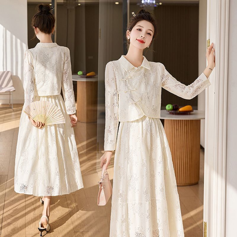 2025春季新款白色蕾丝半身长裙女+蕾丝吊带+蓝色针织开衫三件套装