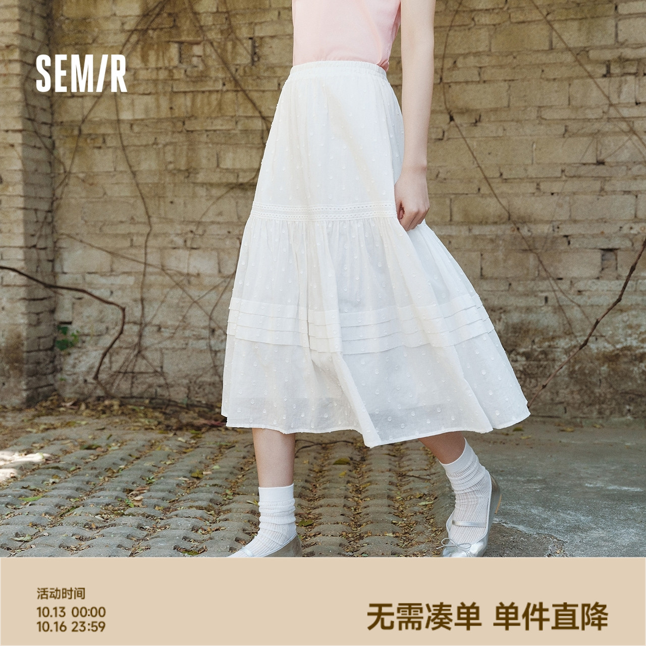 森马半身裙女松紧腰A字裙气质夏季2025新款拼接蕾丝波点长裙优雅