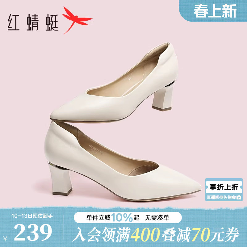 红蜻蜓高跟鞋面试考公女鞋超软小羊皮鞋子粗跟不累脚单鞋白色皮鞋