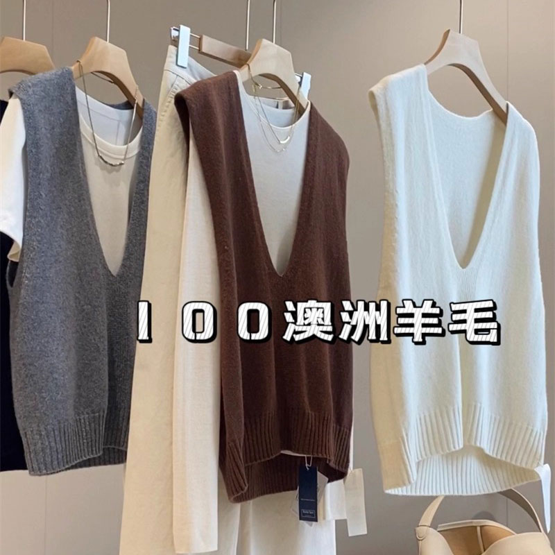 IN BLUE 100澳洲羊毛!知识分子深V领基础纯色针织背心叠搭马甲
