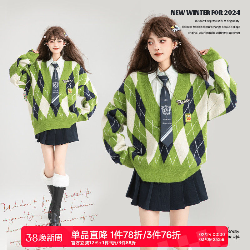 KEIKO 高知风菱格提花针织衫26春季叠搭学院风绿色宽松大V领毛衣