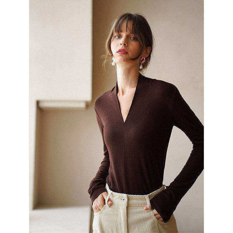 徐莫西 法式风大V领修身针织打底衫T恤女秋装新款露锁骨上衣女