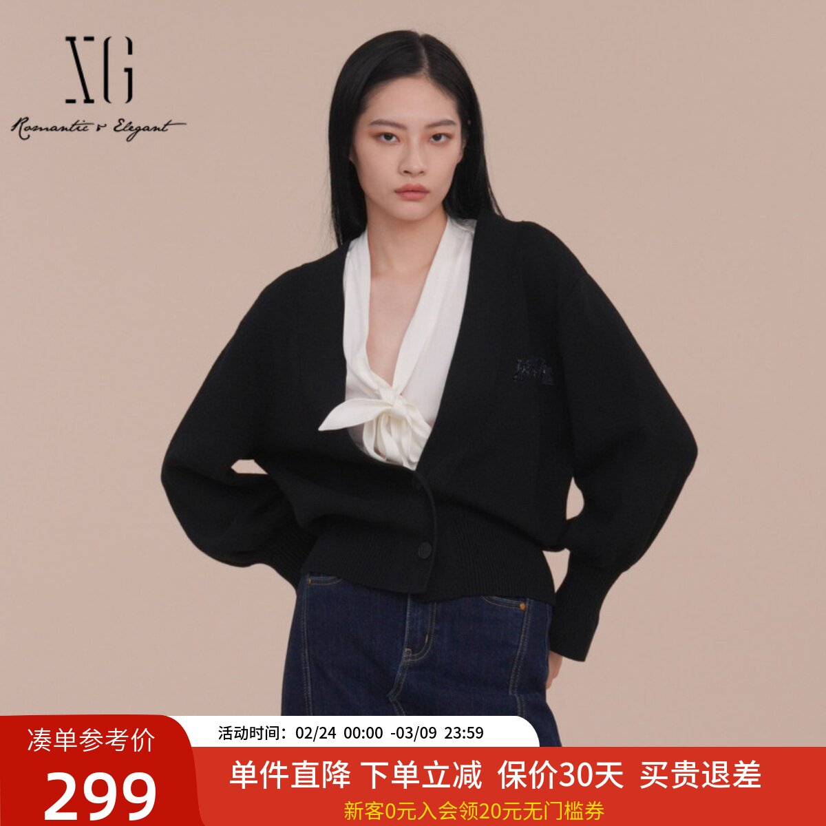 XG雪歌时尚大V领针织衫女2025春新款纯色开衫上衣XK111029A190